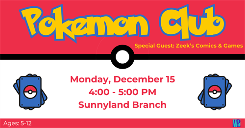 Calling all Pokémon trainers! Come join us for an afternoon of fun with themed games, crafts, and a time to trade cards on the 3rd Monday of the month. Special Guest: Zeek's Comics & Games