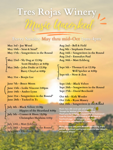 Tres Rojas offers Butch's pizzas, cheeses, dips, crackers and chocolates. We are picnic friendly, so feel free to bring your own foods! Local food trucks attending can be found on our Web or Facebook Page.